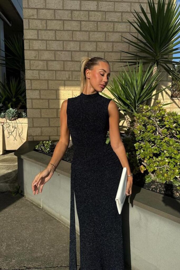 Pair it with a small, patterned clutch to inject a touch of personality. Minimal accessories and sleek hairstyles enhance the dress’s contemporary vibe.