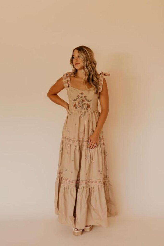Embrace romance with this enchanting beige embroidered maxi dress. Its tiered skirt and floral detailing create a dreamy look, perfect for winter weddings.